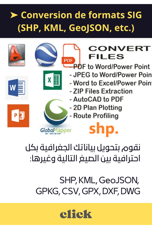 هل تمتلك بيانات جغرافية وتحتاج إلى تحويلها إلى صيغة أخرى؟ نقدم لك خدمة متكاملة لتحويل ملفات نظم المعلومات الجغرافية (SIG/GIS) باحترافية وسرعة، لتلبية مختلف حاجياتك التقنية والعملية.