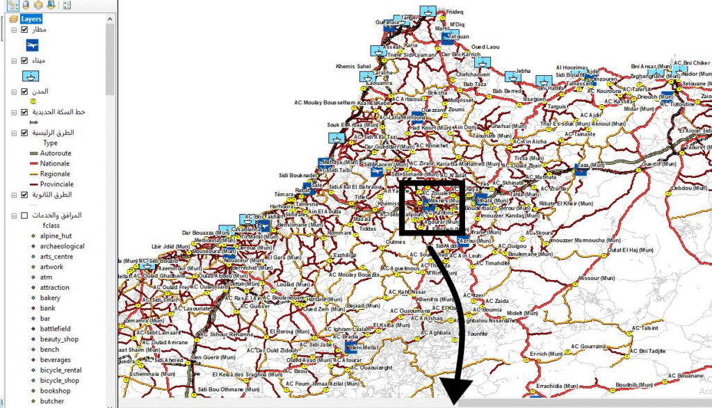 يحتوي الملف على الشبكة الطرقية الرئيسية (الطريق السيار + طريق وطنية وجهوية واقليمية + السكة الحديدية+ + المطارات + الموانئ)